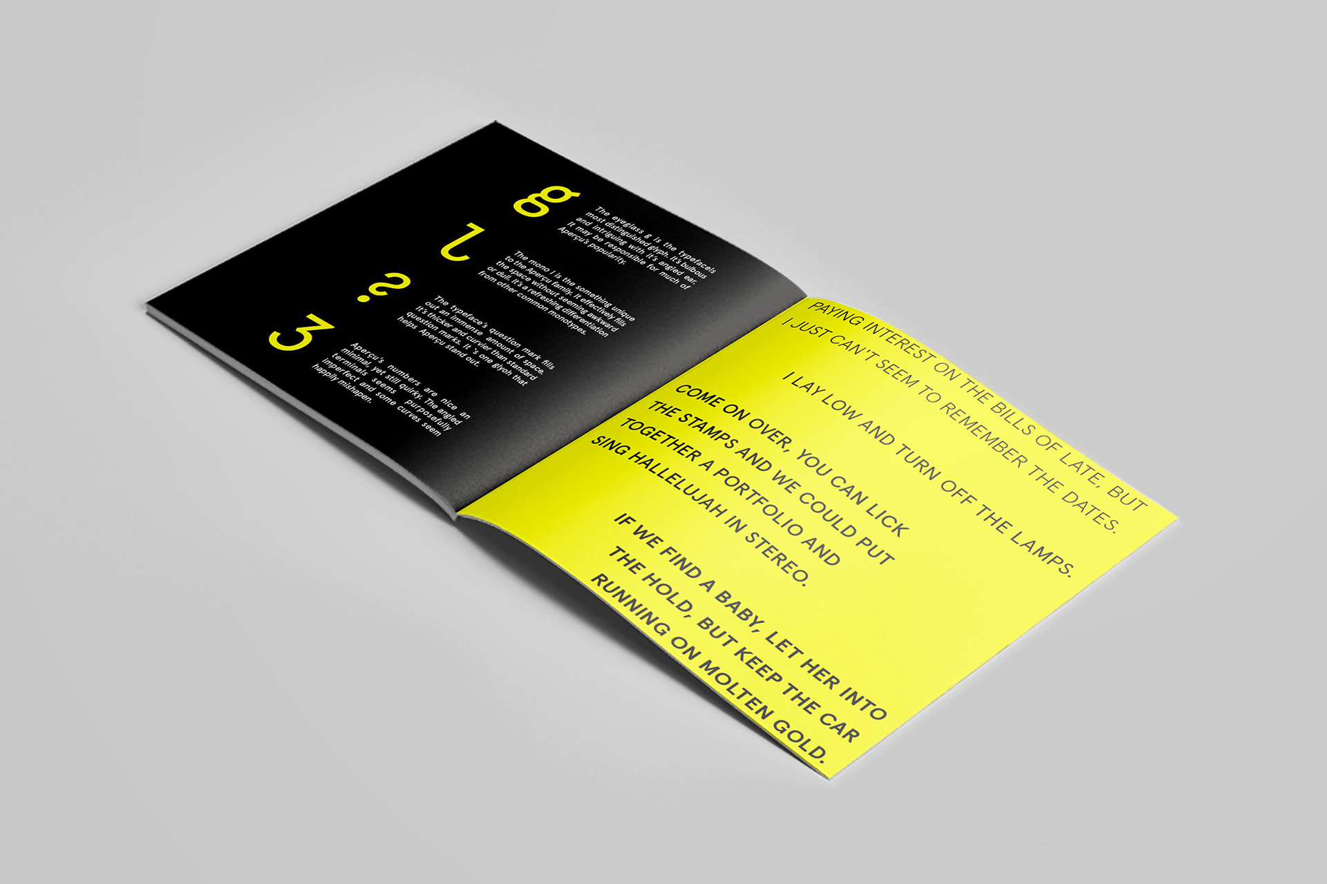 Apercu is a sans serif typeface from the Colophon Foundry. Ice Station Zebra is an experimental rock rap by Jack White. They work together to create a dynamic type specimen that showcases the lively and unique nature of each. It is recommended that you listen to the song while looking through the specimen in order to better understand the designer’s intentions.